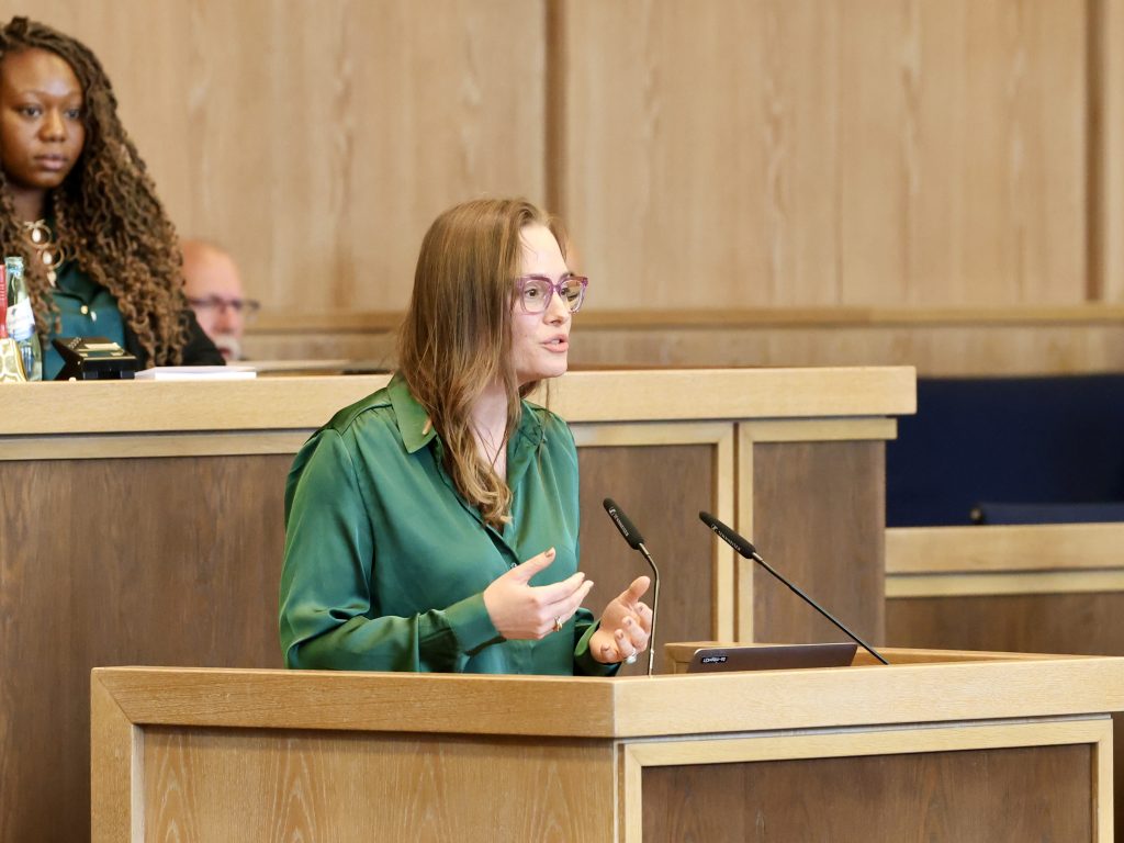 Dana Kube spricht in der Frankfurter StVV. Foto: Carsten Prueser